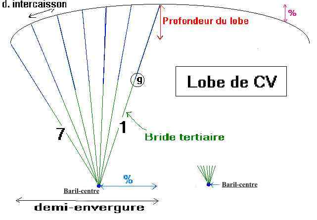 Les brides primaires AB (mauve), CD (jaune) et secondaires EF (bleue) ont à la base chacune une longueur égale à la corde du profil quand le facteur de corde est à 100 %. La bride de lobe tertiaire (verte) a aussi, en moyenne, une longueur égale à la corde; mais cette longueur varie pour lober la canopée faisant en sorte que le bout d'aile soit plus bas que le centre. Le lobe permet d'ouvrir l'aile vers ses bouts et supporte ce que le gonflement produit pour compenser le ratatinement centripète par les lignes de puissance. Plus le bridage est court, moins il provoque de trainée parasite; mais s'il est trop court, il ratatine l'aile et degrade la performance. Alors un compromis optimal se situe autour de ces valeurs empiriques. Le facteur de corde ( normalement 100 % ) permet de raccourcir globalement le bridage. Mais il faut surveiller que les angles soutenues aux points e, f et g restent autant que possible inférieur à l'angle critique ( une autre valeur empirique modifiable). Une alerte est signalée si cette limite angulaire est franchie.
