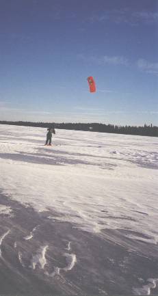 - Bonds : Avec une bonne voilure, il est possible de bondir. Et ce n'est pas du simple saut où le retour au sol est abrupte. Il s'agit plutôt de petits vols, avec auto-décollage et atterrisage en règle, du moins, si le pilotage est bien exécuté avec un minimum de techniques. Mais, oui mais, on ne devrait pas bondir plus haut que sa taille ou d'une hauteur où on est solide pour absorber le choc si éventuellement la sustentation échappait. Bien des aléas de fragilité se cachent dans un cerf-volant de traction: la finesse des lignes est une évidence de fragilité. Aussi structurellement, la charge alaire pour le vol est tout simplement excessive. Donc, pour voler, vaut mieux un appareil conçu et éprouvé pour le vol comme un avion, un deltaplane ou un parapente. Ceci étant dit, bien des mordus du bondissement continueront ce genre d'activité risqué et je ne peux que les conseiller d'au moins inspecter souvent et scrupuleusement leur équipement: la corde inter-batons, les noeuds, la fine voile de spi pour les déchirures et les fragiles lignes susceptibles de s'écorcher à terre ou sur la glace parfois acérée. Et choisir un Vent approprié, stable, que l'on prend le temps de bien observer et ressentir. Ce qui, au fond, est le fondement de la discipline du ski éolien..